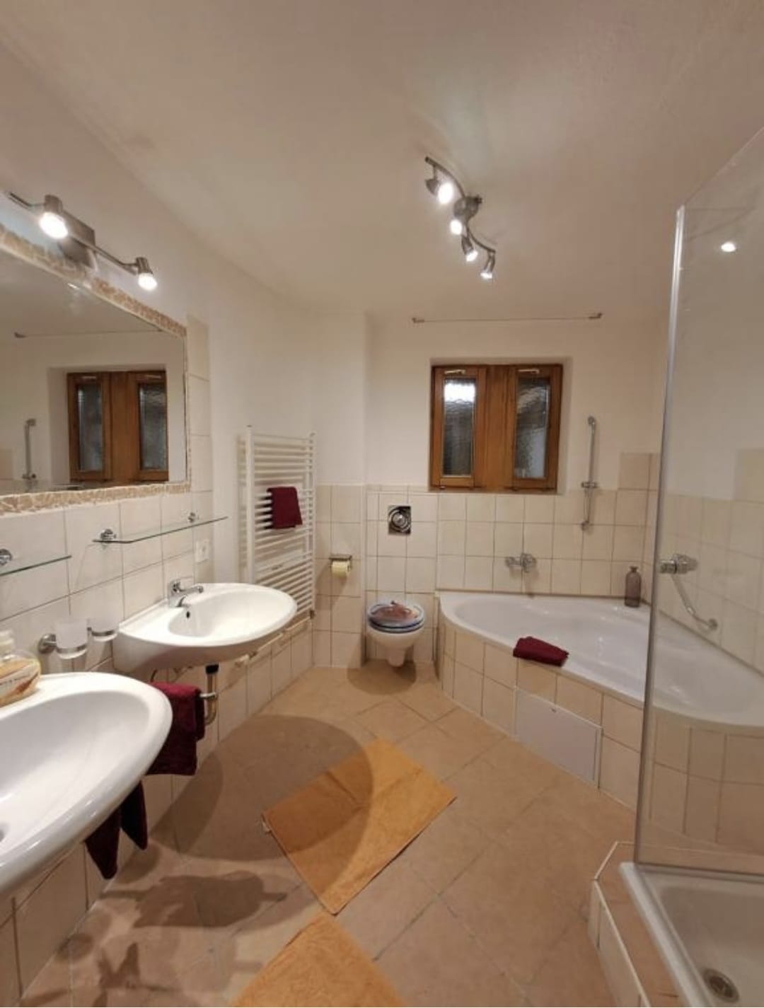 Im Bad findet sich eine große Eck-Badewanne und Dusche.